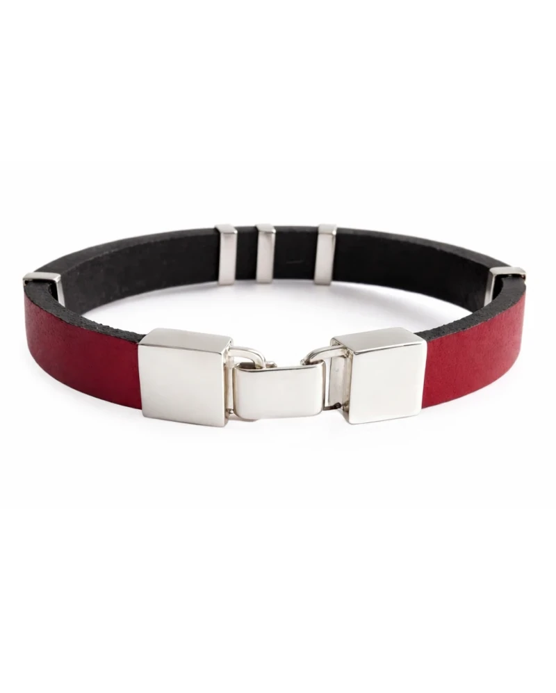Pulsera elaborada en cuero natural de tono rojo, con apliques geométricos en plata 925 que estructuran el diseño y aportan un contraste limpio y contemporáneo. El interior en cuero negro refuerza la resistencia y la comodidad en el uso diario.