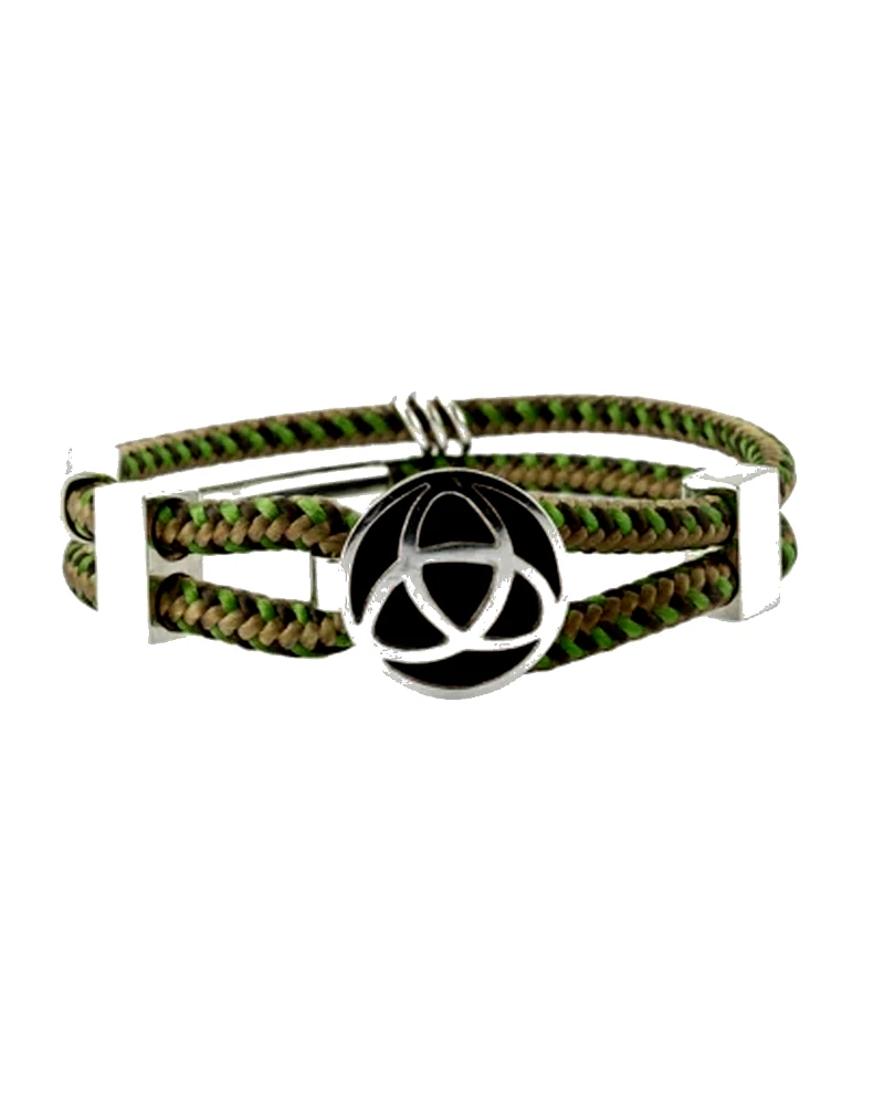 Pulsera elaborada en textil trenzado tipo paracord, en tonos tierra y verde, que aporta resistencia, flexibilidad y un carácter claramente contemporáneo. Incorpora apliques en plata 925, destacando un motivo central circular calado de inspiración geométrica, que actúa como elemento protagonista del diseño.