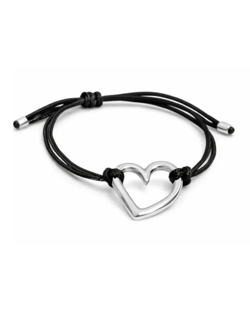 El diseño incorpora un aplique central de plata 925 en forma de corazón, de trazo continuo y acabado pulido, que aporta un contraste elegante y contemporáneo frente al negro profundo del textil. Los terminales en plata refuerzan el conjunto, elevando la percepción de calidad y cuidado en los detalles.