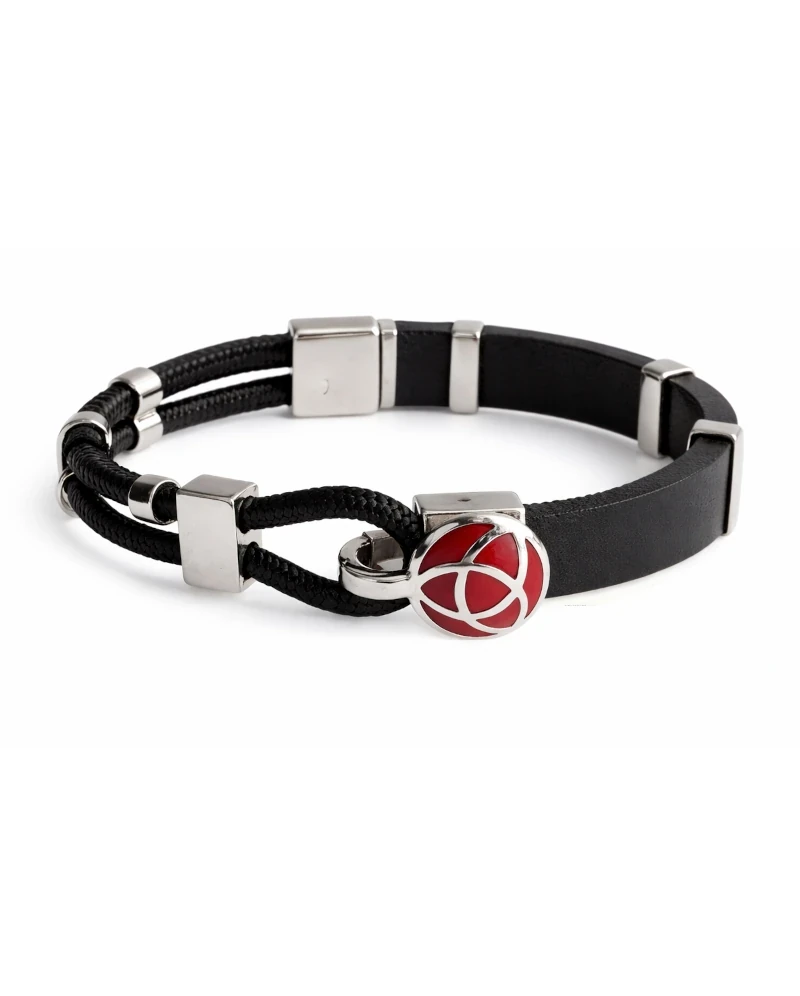 Pulsera elaborada en cuero negro, combinada con cordones textiles y apliques en plata 925 que aportan estructura y carácter al diseño. Incorpora un detalle central esmaltado en rojo, integrado en una pieza metálica de inspiración geométrica, que introduce un punto de color y singularidad.