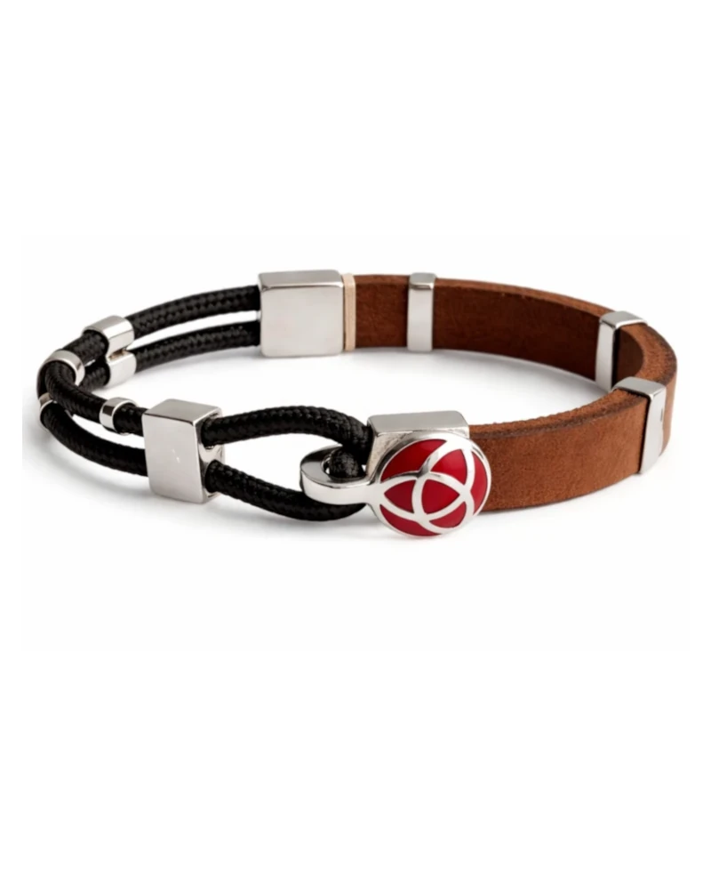 Pulsera elaborada en cuero natural, combinada con apliques en plata 925 que estructuran el diseño y aportan contraste y carácter. La mezcla de materiales genera una estética moderna y equilibrada, donde la calidez del cuero se complementa con la solidez y el brillo de la plata.