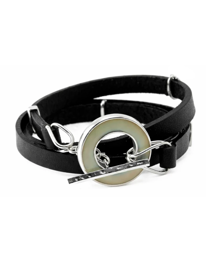 Pulsera elaborada en cuero natural negro, de doble vuelta, combinada con apliques y cierre en plata 925 que aportan contraste y carácter. El diseño incorpora un cierre tipo aro y pasador, donde el aro presenta un detalle central claro que suaviza la estética y aporta un punto distintivo y contemporáneo.
