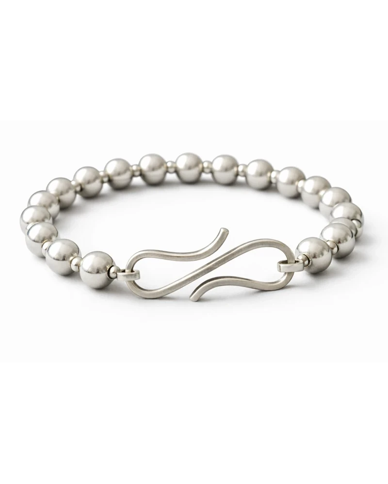 Pulsera elaborada en plata 925, compuesta por cuentas esféricas pulidas que aportan brillo uniforme y una presencia elegante. Incorpora un cierre escultórico ondulado, diseñado como elemento protagonista: funcional, seguro y visualmente distintivo.